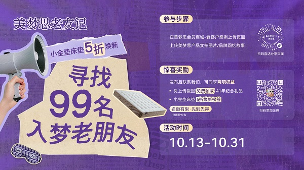 参与规则方面,用户需在美梦思指定渠道上传与美梦思集团(含旗下MEMO’S美梦思、Cozleep斯寐)相关的原创故事、产品使用场景图片,凭上传成功截图联系官方客服登记,即可领取品牌41年纪念礼品,同时获得5折购买小金垫床垫资格,活动参与细则可到官方渠道联系客服咨询。美梦思第二期老友记活动不仅延续了首期活动的温情怀念基调,更通过实质性优惠回馈老用户,充分体现品牌对长期陪伴的重视。